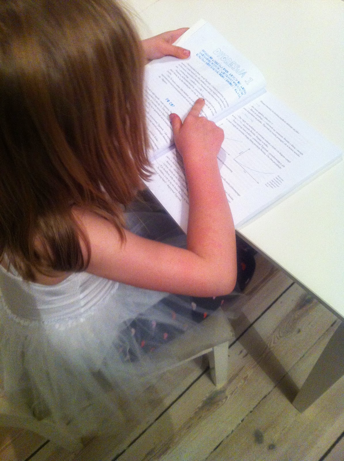 Przeszliśmy kilka lekcji baletu. Kilka lekcji gitary. Kilka lekcji wspinaczki. Na zdjęciu – świeża zawzięta samodzielna lektura podręcznika do fizyki. W stroju baletowym. Wszystko rozpoczynane jako ogromne marzenie Mai, starannie ćwiczone przez krótki okres czasu, a potem – dyskretne porzucane. Rasowe nawianie z szukaniem, co by tu jeszcze innego.